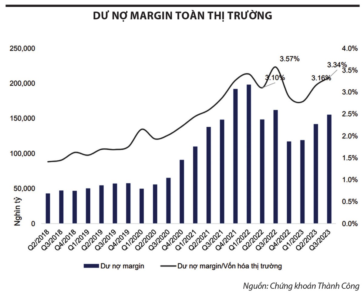 Ông Nguyễn Thành Trung, Giám đốc Phân tích, Công ty Chứng khoán Thành Công (TCSC) cho biết, tính tới cuối tháng 9, tỷ suất sinh lời của VN-Index cũng như mức mất giá của đồng nội tệ tích cực hơn so với nhiều nước trong khu vực. Điều này dẫn đến áp lực chốt lời của nhà đầu tư, nhất là khối ngoại, trong bối cảnh Cục Dự trữ Liên bang Mỹ (Fed) neo lãi suất ở mức cao. Tuy nhiên, khi thị trường Việt Nam giảm trở lại, chênh lệch tỷ suất sinh lợi với các nước không còn lớn, dòng vốn ngoại đã có dấu hiệu quay lại mua ròng trong những phiên gần đây. Yếu tố dư nợ giao dịch ký quỹ (margin) khiến nhiều nhà đầu tư lo ngại, nhưng thông tin mà TCSC cập nhật gần đây thì tình hình margin toàn thị trường an toàn hơn so với tháng 9.