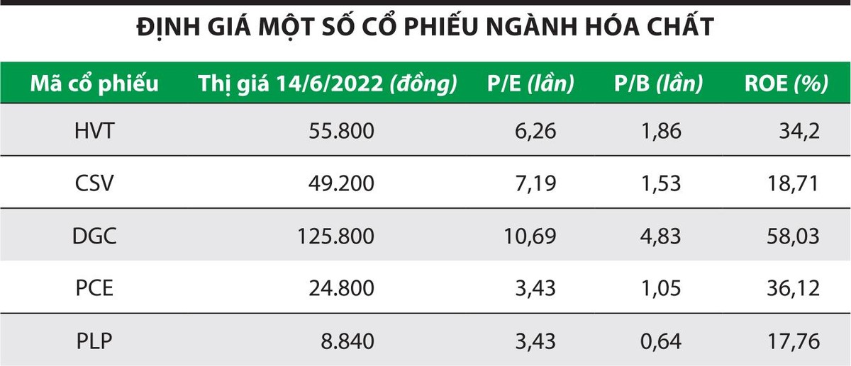 Nhờ kết quả kinh doanh tốt và triển vọng tăng trưởng tích cực, các cổ phiếu ngành hóa chất như DGC, HVT, CSV vẫn thu hút dòng tiền trong bối cảnh thị trường chung chịu áp lực rung lắc mạnh. Với thị giá ngày 14/6/2022, CSV tăng 15,7% so với hồi đầu năm; HVT đi ngang; nhưng DGC giảm 20%...