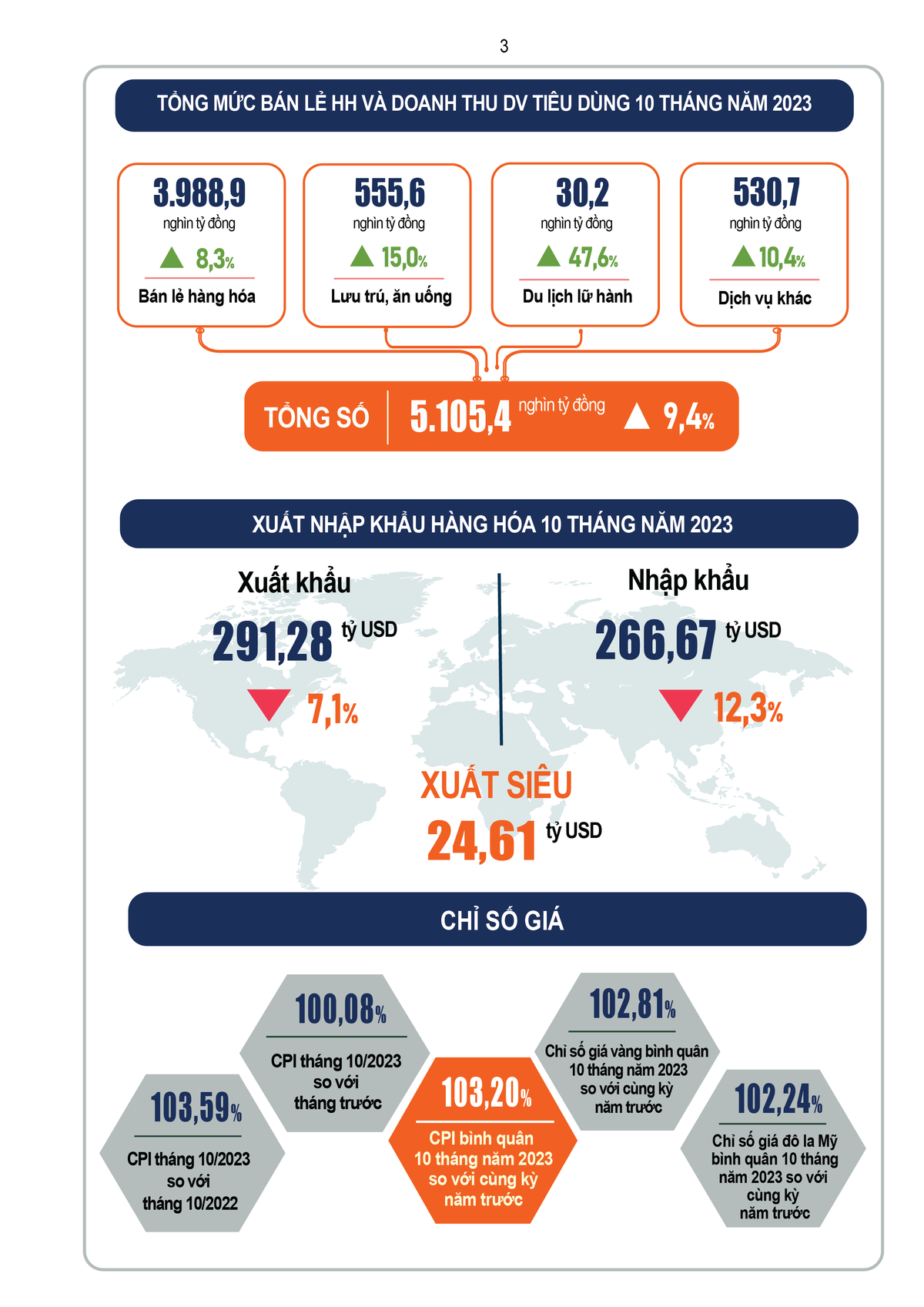 Tính chung 10 tháng năm 2023, tổng mức bán lẻ hàng hóa và doanh thu dịch vụ tiêu dùng theo giá hiện hành ước đạt 5.105,4 nghìn tỷ đồng, tăng 9,4% so với cùng kỳ năm trước (cùng kỳ năm 2022 tăng 20,8%), nếu loại trừ yếu tố giá tăng 6,9% (cùng kỳ năm 2022 tăng 16,7%).