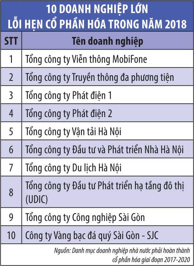 Ngược lại, hàng loạt “ông lớn” nằm trong sự mong đợi của nhà đầu tư trong và ngoài nước từ nhiều năm nay như Tổng công ty Viễn thông MobiFone, Tổng công ty Phát điện 1 (EVNGenco1), Tổng công ty Phát điện 2 (EVNGenco2), Công ty Vàng bạc đá quý Sài Gòn (SJC)… đến thời điểm này được coi như lỗi hẹn với kế hoạch cổ phần hóa vì nhiều lý do.