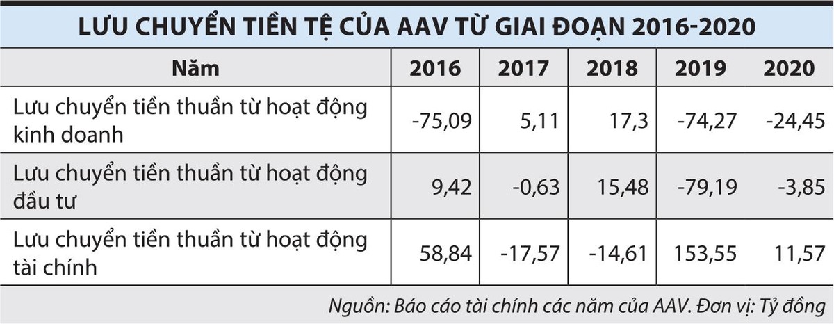 Những năm gần đây, hoạt động kinh doanh của AAV khá trồi sụt, tình hình tài chính cũng không mấy sáng sủa khi dòng tiền kinh doanh thường trong tình trạng âm.