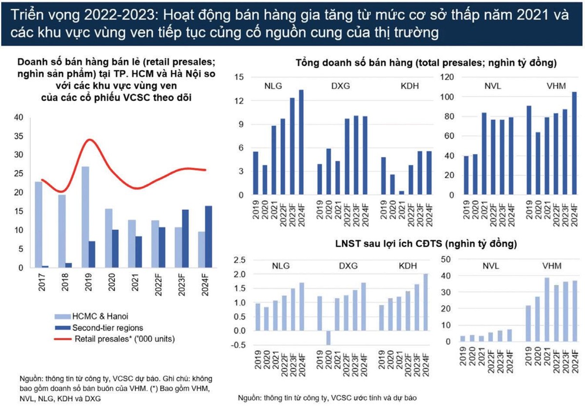 VCSC cũng kỳ vọng tiến độ bán hàng của KDH sẽ khởi sắc trong giai đoạn 2022 - 2023 so với mức cơ sở thấp ở giai đoạn 2020 - 2021. Trong đó, các dự án Classia, The Privia và Clarita sẽ đóng góp gần 90% tổng doanh số bán hàng và xấp xỉ 70% lãi ròng của doanh nghiệp trong giai đoạn này.