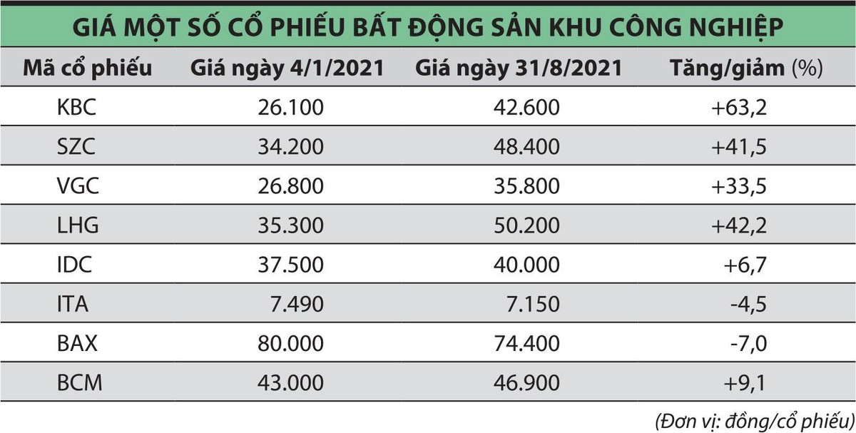 Trên sàn chứng khoán, không ít cổ phiếu bất động sản khu công nghiệp tính đến cuối tháng 8 có mức giá tăng cao so với đầu năm 2021 như KBC tăng 60%, LHG tăng 42,2%, SZC tăng 41,5%, VGC tăng 33,5%...