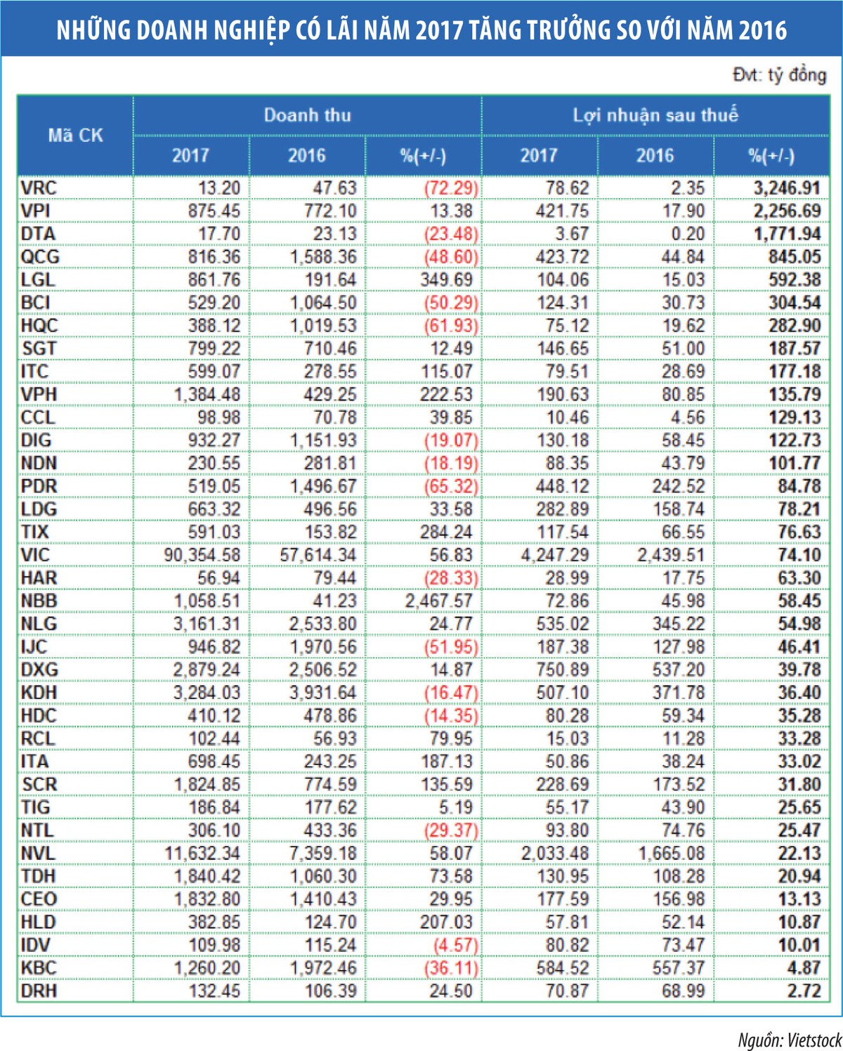 Xếp vị trí thứ hai về mức tăng trưởng doanh thu trong nhóm ngành là NVL. So với năm 2016, doanh thu năm 2017 của NVL tăng trưởng 58%, đạt 11.632 tỷ đồng, trong khi lợi nhuận tăng trưởng 22,1%, đạt 2.033 tỷ đồng.