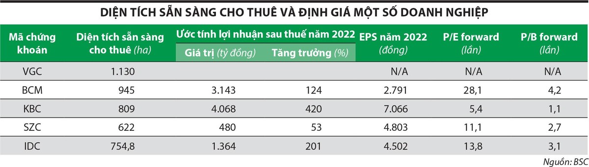 Xét về định giá nhóm bất động sản công nghiệp, theo Trung tâm Phân tích và Tư vấn đầu tư, Công ty Chứng khoán SSI (SSI Research), định giá P/E đang là 23,82 lần và P/B là 2,46 lần. Trong khi đó, P/E forward (dự phóng) tới cuối năm 2022 của cổ phiếu KBC chỉ là 5,4 lần, SZC là 11,1 lần, IDC là 13,8 lần, thấp hơn mức trung bình ngành. Điều này đồng nghĩa với giá cổ phiếu vẫn hấp dẫn.