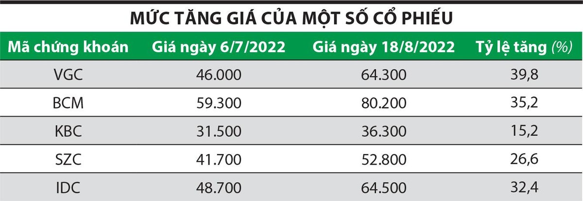 Trong đợt phục hồi của thị trường chứng khoán kể từ ngày 6/7/2022 đến 18/8/2022, VN-Index tăng 10,8%, từ 1.149,61 điểm lên 1.273,66 điểm. Trong khi đó, nhóm 5 cổ phiếu bất động sản công nghiệp lớn đạt mức tăng từ 15,2 - 39,8%, đó là các mã VGC của Tổng công ty Viglacera - CTCP (Viglacera), IDC của Tổng công ty IDICO - CTCP (IDICO), KBC của Tổng công ty Phát triển Đô thị Kinh Bắc - CTCP (Kinh Bắc), SZC của Công ty cổ phần Sonadezi Châu Đức (Sonadezi Châu Đức), BCM của Tổng công ty Đầu tư và Phát triển công nghiệp - CTCP (Becamex).