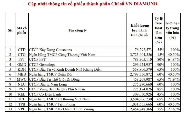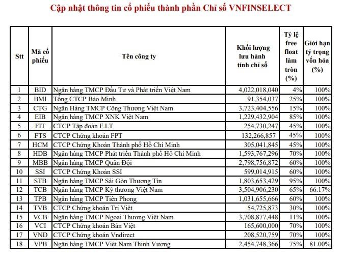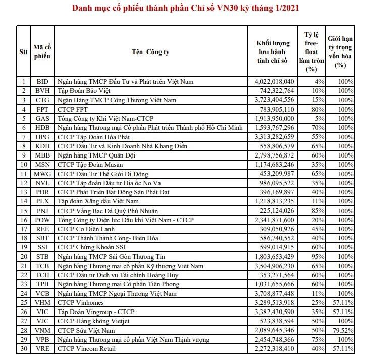Các cổ phiếu dự phòng cho rổ VN30 cũng được thông báo gồm 5 mã là VHC,VPI, GEX, PHR, KBC.