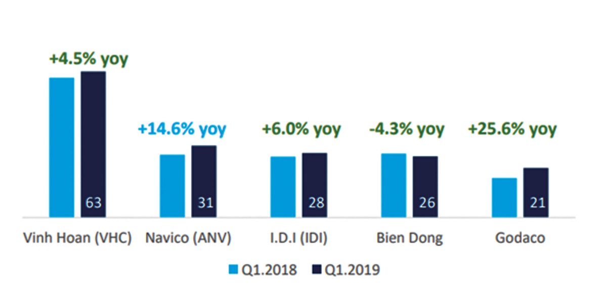 Vĩnh Hoàn có thị trường chính là Mỹ, đóng góp khoảng 60% doanh thu trong vài năm qua. Tuy nhiên, doanh nghiệp này đang gia tăng xuất khẩu vào thị trường Trung Quốc, từ mức 2% năm 2014 tăng lên 18% năm 2018. Quý I vừa qua, VHC tiếp tục ghi nhận kết quả tích cực với doanh thu 1.789 tỷ đồng, giảm nhẹ so với cùng kỳ 2018; lợi nhuận sau thuế hơn 307 tỷ đồng, tăng hơn 212%. Biên lợi nhuận gộp cao, ở mức hơn 23,5%, một phần nhờ giá bán (chủ yếu ở thị trường Mỹ) vẫn neo ở giá cao, trong khi thị trường Trung Quốc gần như điều chỉnh ngay theo giá đầu vào giảm.