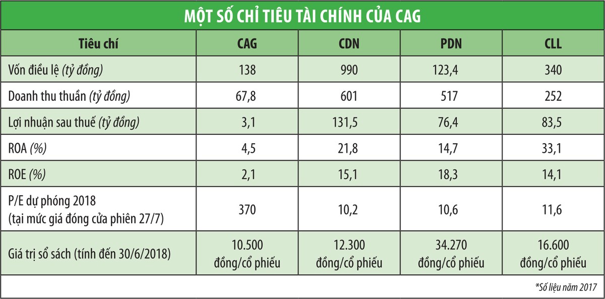 Niêm yết vào ngày 4/12/2017 với giá khởi điểm 11.000 đồng/cổ phiếu, dù không nhận được nhiều sự chú ý của nhà đầu tư, nhưng tính đến hết ngày 30/7, cổ phiếu CAG đạt hơn 107.000 đồng/cổ phiếu. Theo kế hoạch kinh doanh năm 2018, CAG dự kiến doanh thu 74 tỷ đồng, lợi nhuận sau thuế 4 tỷ đồng, tăng lần lượt 10% và 29% so với năm 2017. Ở mức thị giá này, trên vốn điều lệ 138 tỷ đồng, CAG đang sở hữu mức P/E dự phóng không tưởng… hơn 350 lần.
