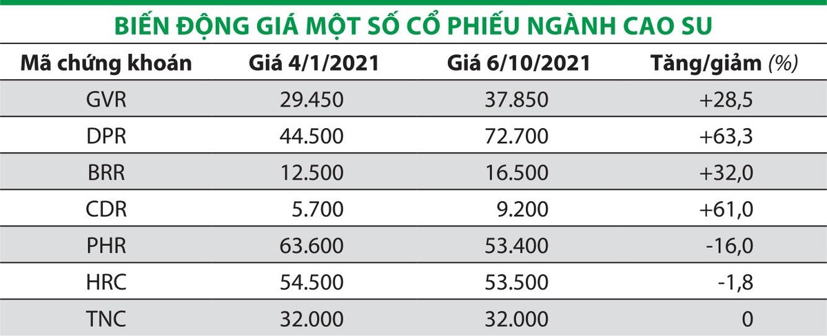 Giới phân tích nhận định, kết quả kinh doanh của các công ty cao su chủ yếu đến từ hoạt động xuất khẩu và phụ thuộc vào giá cao su thế giới. Giá cao su tăng giúp nhóm cổ phiếu này thu hút được sự quan tâm của nhà đầu tư, nhưng lợi nhuận các doanh nghiệp sẽ có sự phân hóa rõ nét. Riêng các doanh nghiệp săm lốp, triển vọng hoạt động tích cực sẽ rơi vào giai đoạn đầu năm 2022, khi nhu cầu mua ô tô dự kiến phục hồi.