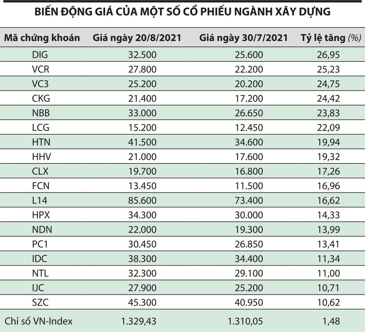 Do đó, cùng với diễn biến thuận lợi của thị trường, yếu tố kỳ vọng được hưởng lợi từ việc Chính phủ nỗ lực đẩy mạnh đầu tư công đã giúp các doanh nghiệp có liên quan như xây dựng, vật liệu xây dựng, bất động sản… thu hút được sự quan tâm rất lớn của dòng tiền, qua đó giúp cho giá cổ phiếu của các doanh nghiệp này tăng cao trong thời gian qua.