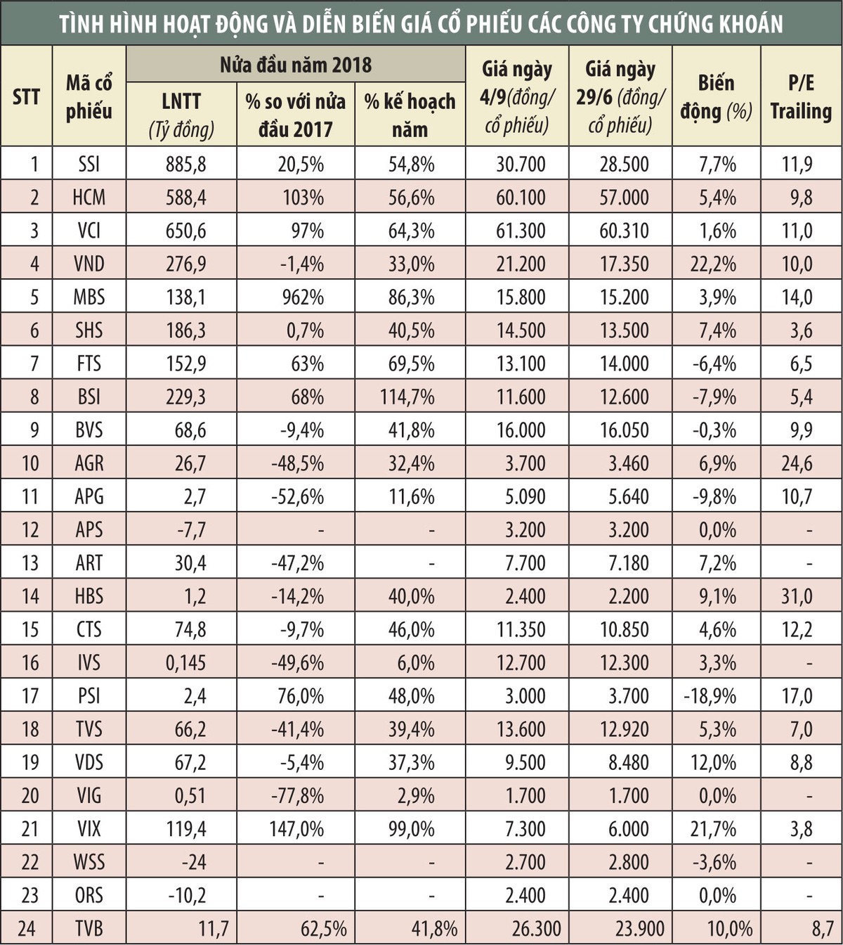 Danh mục FVTPL của VND đến cuối quý II/2018 đã giảm 12,1% so với giá trị sổ sách. Tại SHS, trong khi mức lãi của danh mục FVTPL (chiếm 22,7% tổng tài sản) giảm 18,3% thì khoản lỗ tăng 5,4%. Tại TVS, khoản đầu tư FVTPL lỗ ròng 38,9 tỷ đồng (cùng kỳ 2017 lãi 53,5 tỷ đồng), khiến lợi nhuận chung giảm mạnh.