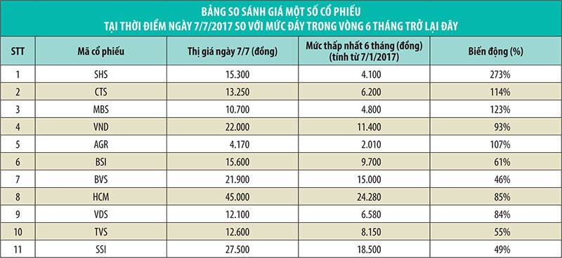 Tính từ đầu năm 2017 đến nay, nhiều cổ phiếu chứng khoán đã tăng giá hơn 100% như SHS, VND, MBS. Đà tăng của nhóm cổ phiếu chứng khoán ngoài yếu tố thị trường, thì còn nhờ kỳ vọng về hiệu quả kinh doanh tích cực của nhóm ngành này trong 6 tháng đầu năm.