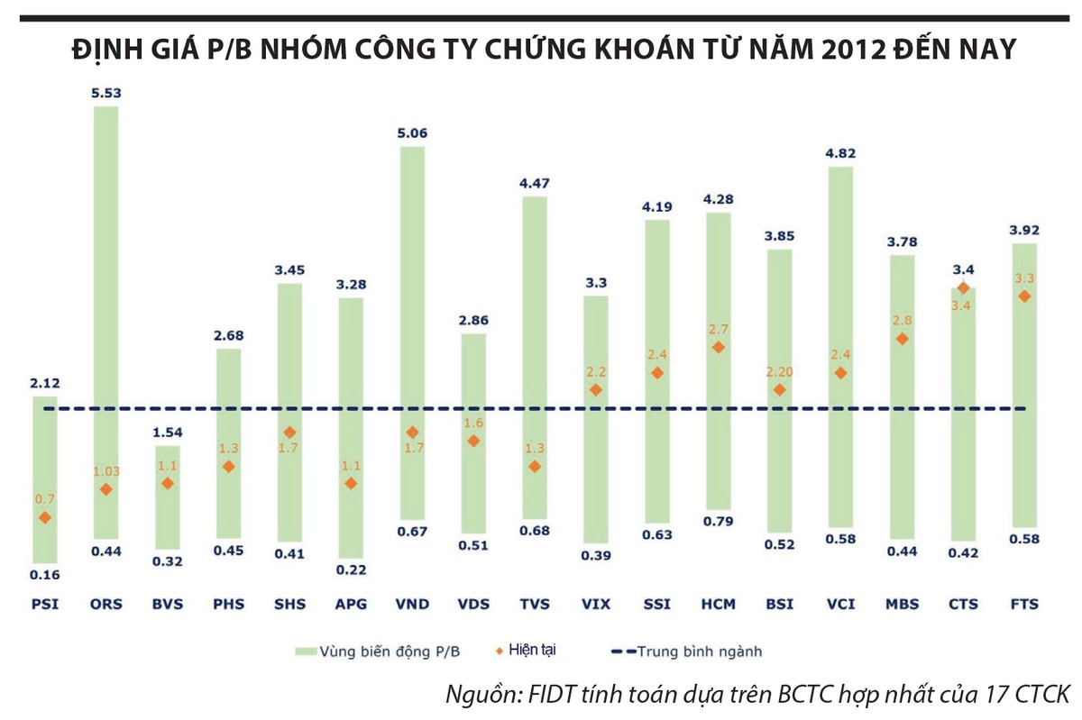 Ông Bùi Văn Huy, Phó chủ tịch Hội đồng quản trị Công ty cổ phần Đầu tư FIDT nhận định, xu hướng thị trường thuận lợi và kỳ vọng nâng hạng cận kề đang khiến nhóm chứng khoán thu hút dòng tiền. Tuy nhiên, định giá nhóm này hiện không hề thấp, cổ phiếu đang được giao dịch ở trên mức trung bình 5 năm dựa trên các chỉ số P/E, P/B.