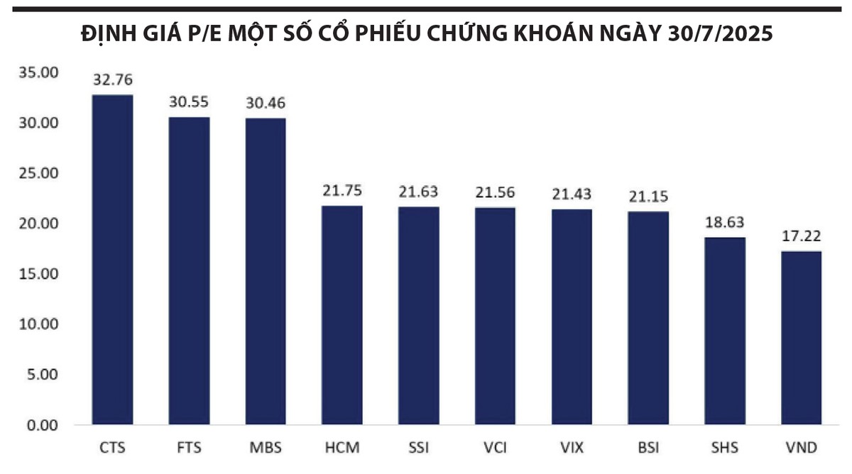 Theo thống kê của Công ty Chứng khoán Công thương (mã CTS), tính đến cuối tháng 7/2025, nhóm cổ phiếu chứng khoán có P/E là 23,5 lần, chỉ cách 3,15% so với mức +1 Standard Deviation (độ lệch chuẩn) và cao hơn khoảng 41,9% so với mức trung bình giai đoạn 2020 - tháng 7/2025. Đây vẫn chưa phải là mức định giá quá đắt, nhưng đòi hỏi nhà đầu tư cần tìm hiểu kỹ về cơ cấu doanh thu, lợi thế cạnh tranh và tiềm năng của các công ty chứng khoán trước khi giải ngân, bởi nhiều khả năng nhóm cổ phiếu này sẽ tiếp tục có sự phân hóa mạnh mẽ.