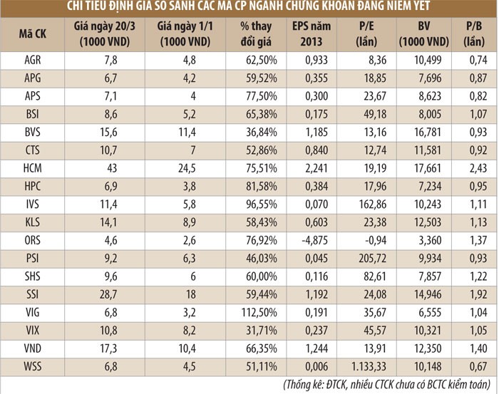 Với mức tăng giá thấp nhất là 31,71% (của cổ phiếu VIX của CTCP Chứng khoán Xuân Thành), cổ phiếu các CTCK niêm yết xứng đáng được coi là nhóm ngành đầu tư rất hiệu quả của quý I/2014.