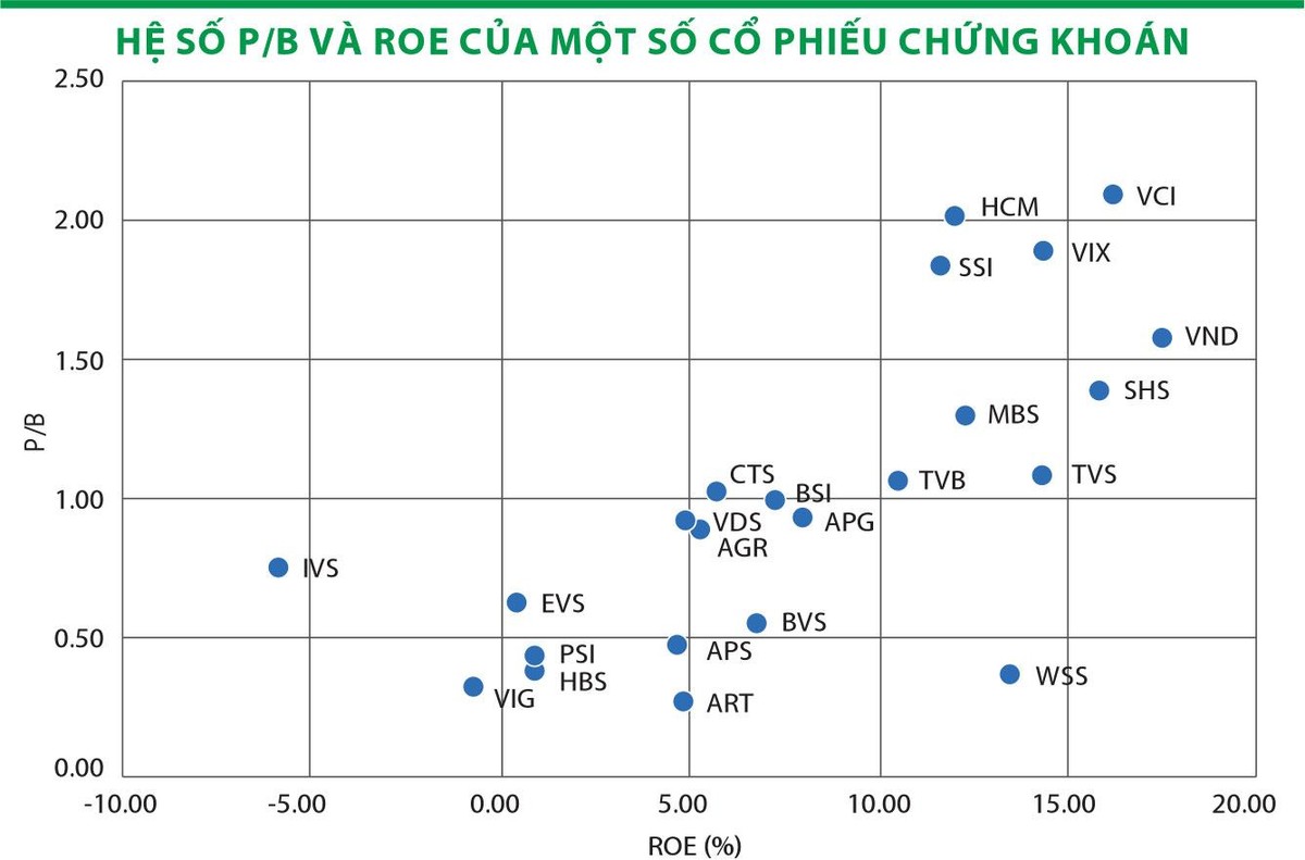 Được biết, tỷ lệ ROE tại nhiều công ty chứng khoán đang ở mức trên dưới 10%. Những công ty có lợi thế cạnh tranh hoặc có sản phẩm, dịch vụ đặc thù, mang lại hiệu quả cao có ROE cao hơn. Theo đó, cổ phiếu của các công ty này, nhất là khi có mức định giá P/B (thị giá trên giá trị sổ sách) hợp lý dự kiến sẽ được nhà đầu tư ưu tiên lựa chọn vào danh mục.