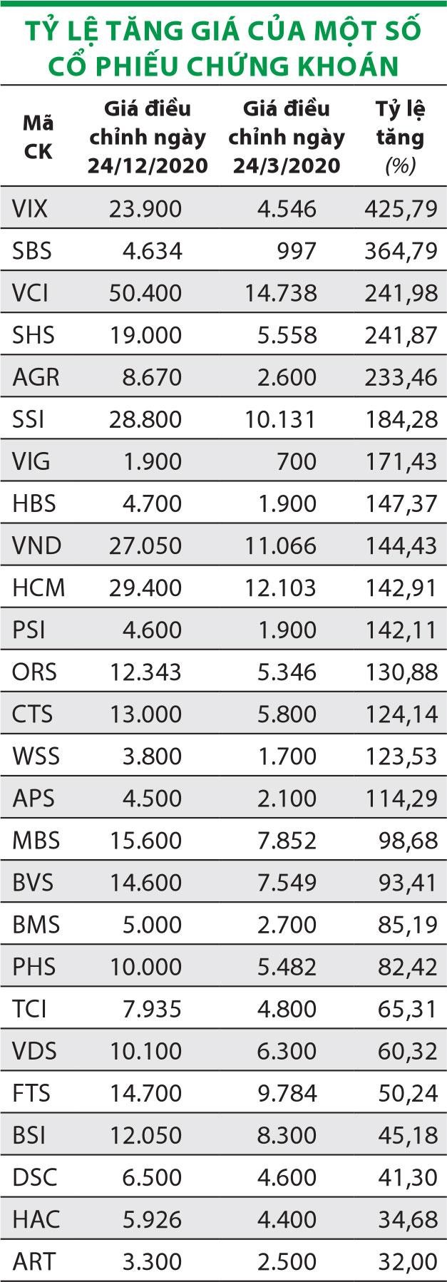 Tương tự, cổ phiếu HBS của Công ty Chứng khoán Hòa Bình, cổ phiếu VIG của Công ty Chứng khoán Công nghiệp Việt Nam cũng tăng giá trần nhiều phiên. Đa số cổ phiếu chứng khoán khác đều tăng giá mạnh.