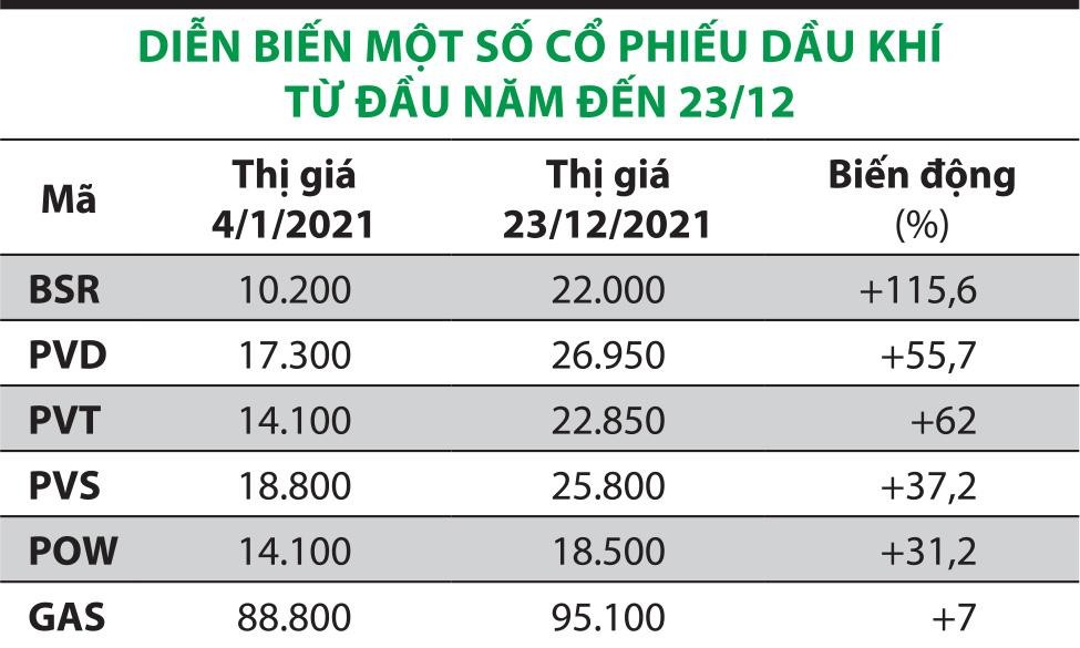 Trên thị trường chứng khoán, 2021 là năm ghi nhận sự thăng hoa của nhóm dầu khí khi phần đa số cổ phiếu nhóm này có sự tăng trưởng mạnh mẽ. Cổ phiếu BSR tăng 114%, cổ phiếu PVD tăng 54,3%, cổ phiếu PVS tăng 37,2%, PVT tăng 34,7%, GAS tăng 7%...