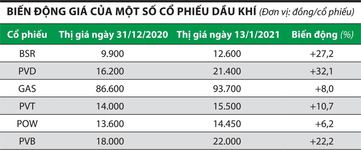 Cổ phiếu PVD của Tổng công ty cổ phần Khoan và Dịch vụ khoan Dầu khí tăng 32%, cổ phiếu BSR của Công ty cổ phần Lọc hóa dầu Bình Sơn tăng hơn 27% trong thời gian từ 1 - 12/1/2021. Sắc xanh bao phủ nhiều cổ phiếu khác trong ngành dầu khí như GAS, PVS, PVB, PVT, POW, OIL…