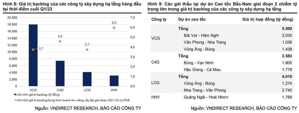 Nhóm phân tích VNDirect tin rằng, các doanh nghiệp xây dựng hạ tầng sẽ được hưởng lợi lớn từ xu hướng đẩy mạnh giải ngân đầu tư công trong giai đoạn 2023 - 2025. Sau khi liên tiếp được chỉ định thầu tại các dự án thành phần của cao tốc Bắc - Nam giai đoạn 2 (đầu năm 2023), các công ty xây dựng hạ tầng hàng đầu đã ghi nhận giá trị backlog (đơn hàng tồn đọng) tăng đáng kể.