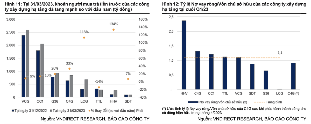 Trung bình tỷ lệ nợ vay ròng/vốn chủ sở hữu của các công ty xây dựng hạ tầng tại cuối quý I là 1,1x, đặc biệt, LCG gần như không có nợ vay ròng. Trong khi đó, do phải hợp nhất nhiều dự án BOT, tỷ lệ nợ vay ròng/vốn chủ sở hữu của HHV và C4G đang cao hơn so với trung bình ngành, đạt lần lượt 2,4x và 1,3x tại cuối quý I/2023.