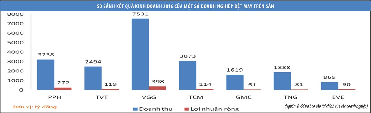 Năm 2016, tỷ suất lợi nhuận trên vốn chủ sở hữu (ROE) của VGG đạt 27,4%, PPH là 19,51% và TVT 20,44%, cao hơn mức trung bình nhóm doanh nghiệp dệt may trên sàn là 17,77% (theo số liệu của CTCK Bảo Việt). Các “lão lãng” như GMC đạt 20,79%; TNG là 16,62%; TCM là 11,8%.