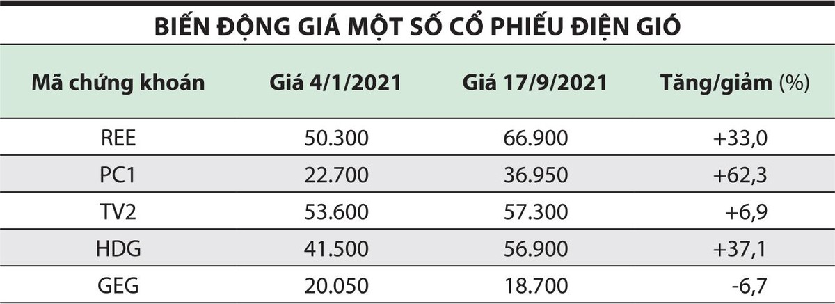 Trên thị trường chứng khoán, một số doanh nghiệp đang đầu tư vào lĩnh vực điện gió là REE, PC1, TV2, TTA, GEG…