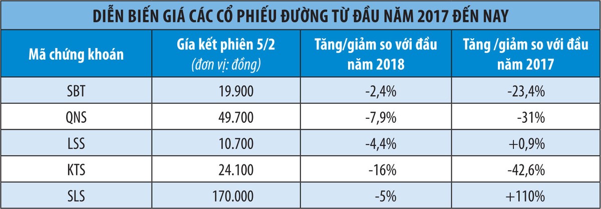 Với những bất cập từ trong nội tại ngành đường và diễn biến không thuận lợi của thị trường đường trong nước và trên thế giới, giới phân tích cho rằng, cổ phiếu ngành đường khó sáng trong năm 2018, dù định giá của các công ty vẫn còn tương đối hấp dẫn so với mặt bằng chung cổ phiếu trên thị trường.