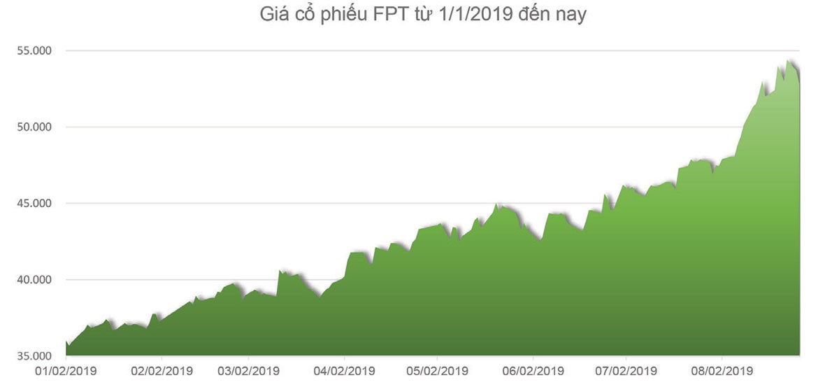 Từ đầu năm 2019 đến nay, đồ thị giá cổ phiếu FPT đi lên khá ngoạn mục. Từ mức giá xấp xỉ 35.000 đồng/cổ phần (tính trên giá điều chỉnh kỹ thuật do trả cổ tức) vào tháng 1, đến nay, cổ phiếu này đang giao dịch quanh mốc 54.000 đồng/cổ phần. Như vậy, thị giá FPT đã đạt mức tăng trưởng trên 50% kể từ đầu năm và theo khuyến nghị của nhiều công ty chứng khoán, FPT là cổ phiếu đáng chú ý cả về các chỉ số tài chính và triển vọng doanh nghiệp trên thị trường. Các công ty chứng khoán cũng dự báo, cổ phiếu FPT sẽ tiếp tục lập những đỉnh giá mới trong thời gian từ nay đến cuối năm.