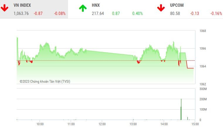 Chốt phiên, sàn HOSE có 227 mã tăng và 146 mã giảm, VN-Index giảm 0,87 điểm (-0,08%) xuống 1.063,76 điểm. Tổng khối lượng giao dịch đạt hơn 640,71 triệu đơn vị, giá trị 10.888,67 tỷ đồng, giảm 4,3% về khối lượng và 6,97% về giá trị so với phiên hôm qua. Giao dịch thỏa thuận đóng góp 44,87 triệu đơn vị, giá trị 1.463,38 tỷ đồng.