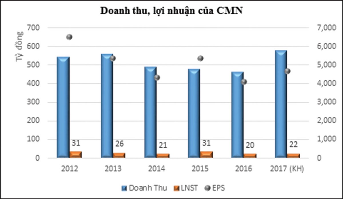 Năm 2016, sản lượng tiêu thụ của CMN đạt 14.859 tấn, giảm 8,81% so với năm 2015 (và chỉ hoàn thành 82,55% kế hoạch 2016), kéo theo doanh thu, lãi ròng giảm tương ứng 3,56% và 36,76%. Đáng chú ý, tình trạng doanh thu, lợi nhuận giảm không phải mới xảy ra, mà đã kéo dài trong suốt giai đoạn 2011-2014. Sau khi hồi phục nhẹ trong năm 2015, các kết quả đạt được đã nhanh chóng giảm trở lại trong năm 2016.