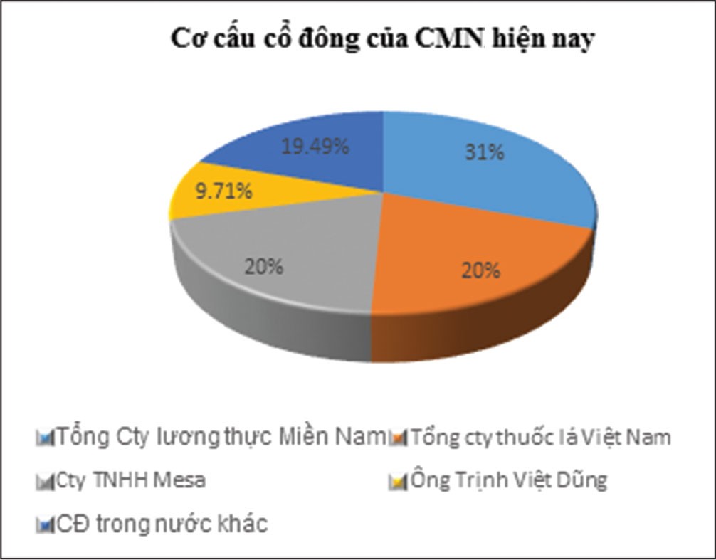 Tính đến hết năm 2016, quy mô tài sản của CMN đạt 196,77 tỷ đồng, tăng 6,2% so với 2015, khá nhỏ nếu so sánh với các “ông lớn” trong ngành mì gói khác hiện nay như Acecook, Masan, Asia Food… Trong đó, lớn nhất là các khoản tiền và tương đương tiền 122,3 tỷ đồng, chiếm 62,17% tổng tài sản, tiếp theo là tài sản cổ định chiếm 16,84%, hàng tồn kho chiếm 11,83%.