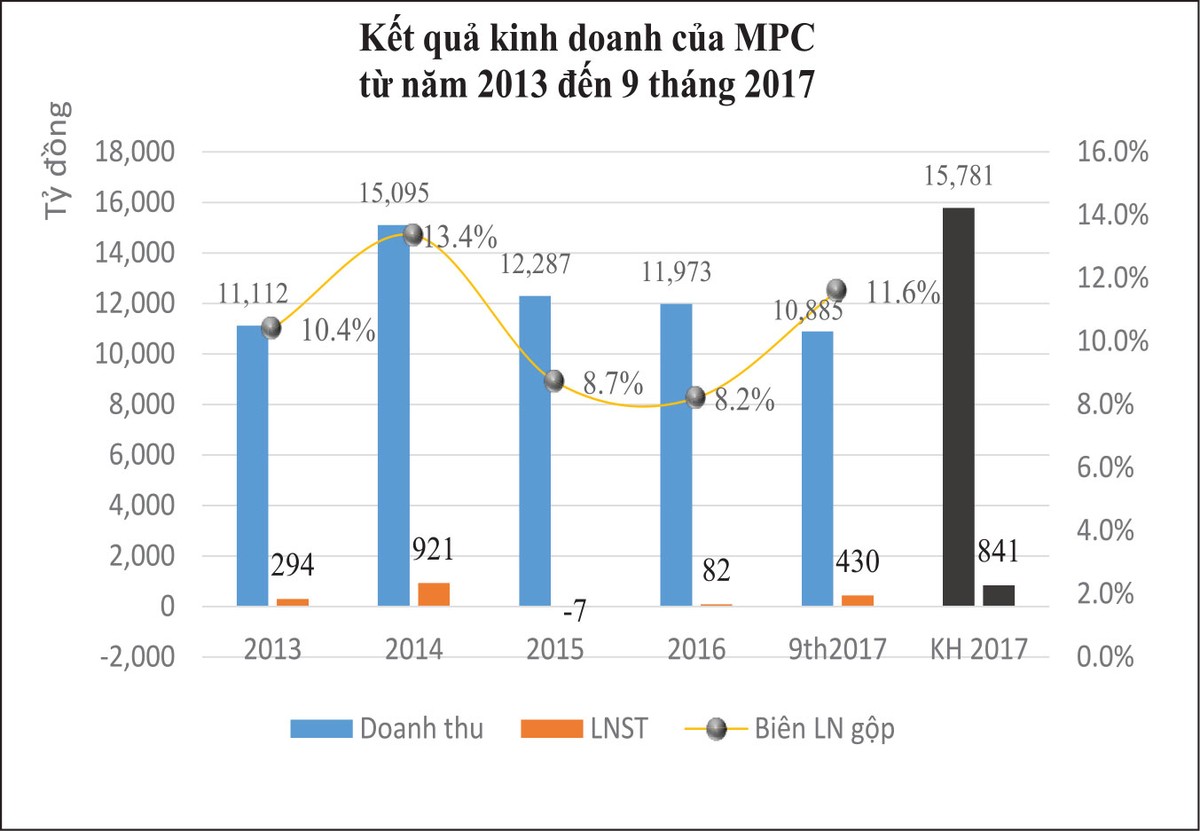 Trước đó, trong báo cáo tài chính quý III/2017, MPC cho biết đã đạt 10.885 tỷ đồng doanh thu và 430 tỷ đồng lợi nhuận sau thuế. Như vậy, chỉ riêng tháng 10, MPC ghi nhận kết quả kinh doanh đột biến với doanh thu 1.787,8 tỷ đồng và 127,2 tỷ đồng lợi nhuận sau thuế, tương đương 16,5% doanh thu và 29,5% lợi nhuận đạt được 9 tháng trước đó. Điều này phản ánh tính chu kỳ kinh doanh của MPC, khi những tháng cuối năm là thời điểm tiêu thụ sản phẩm tốt nhất nhằm đáp ứng nhu cầu các dịp lễ lớn cuối năm và đầu năm mới.