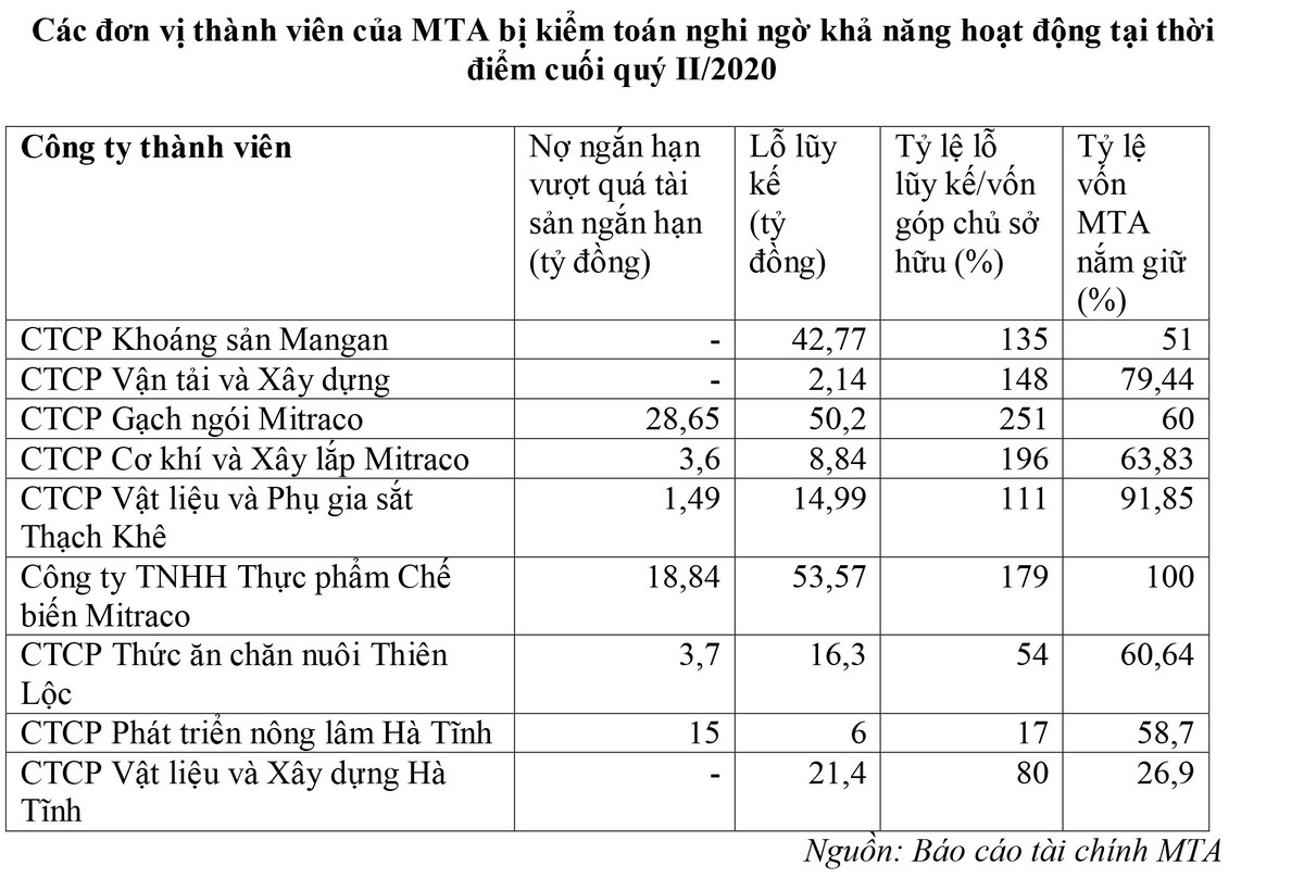 Lấn sân sang nhiều lĩnh vực ngoài ngành nghề cốt lõi, nhưng nhiều đơn vị thành viên hoạt động kém hiệu quả là nguyên nhân chính khiến MTA liên tiếp thua lỗ. Không ít công ty con rơi vào tình trạng nợ phải trả ngắn hạn lớn hơn tài sản ngắn hạn và lỗ lũy kế nhiều năm, dẫn đến kiểm toán nghi ngờ đáng kể về khả năng hoạt động liên tục của các công ty.