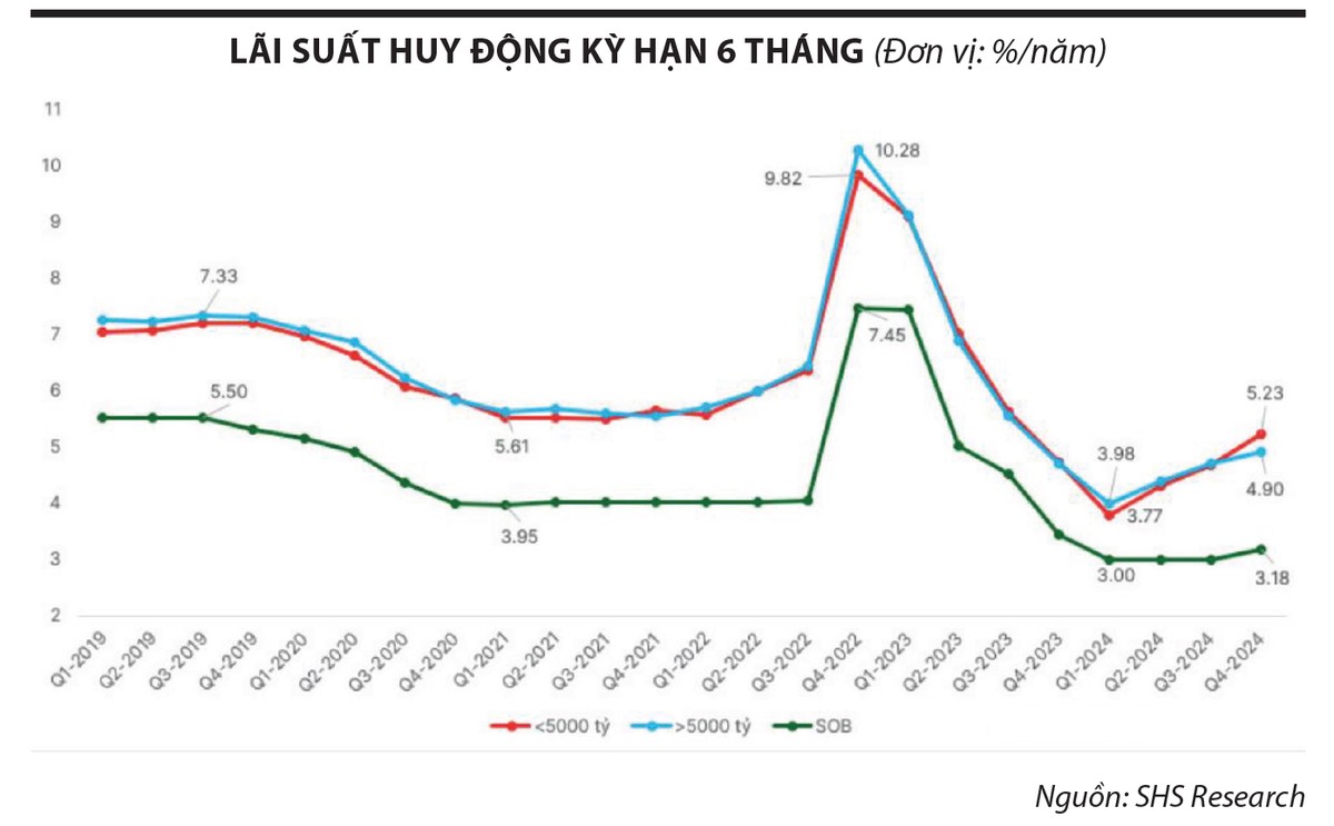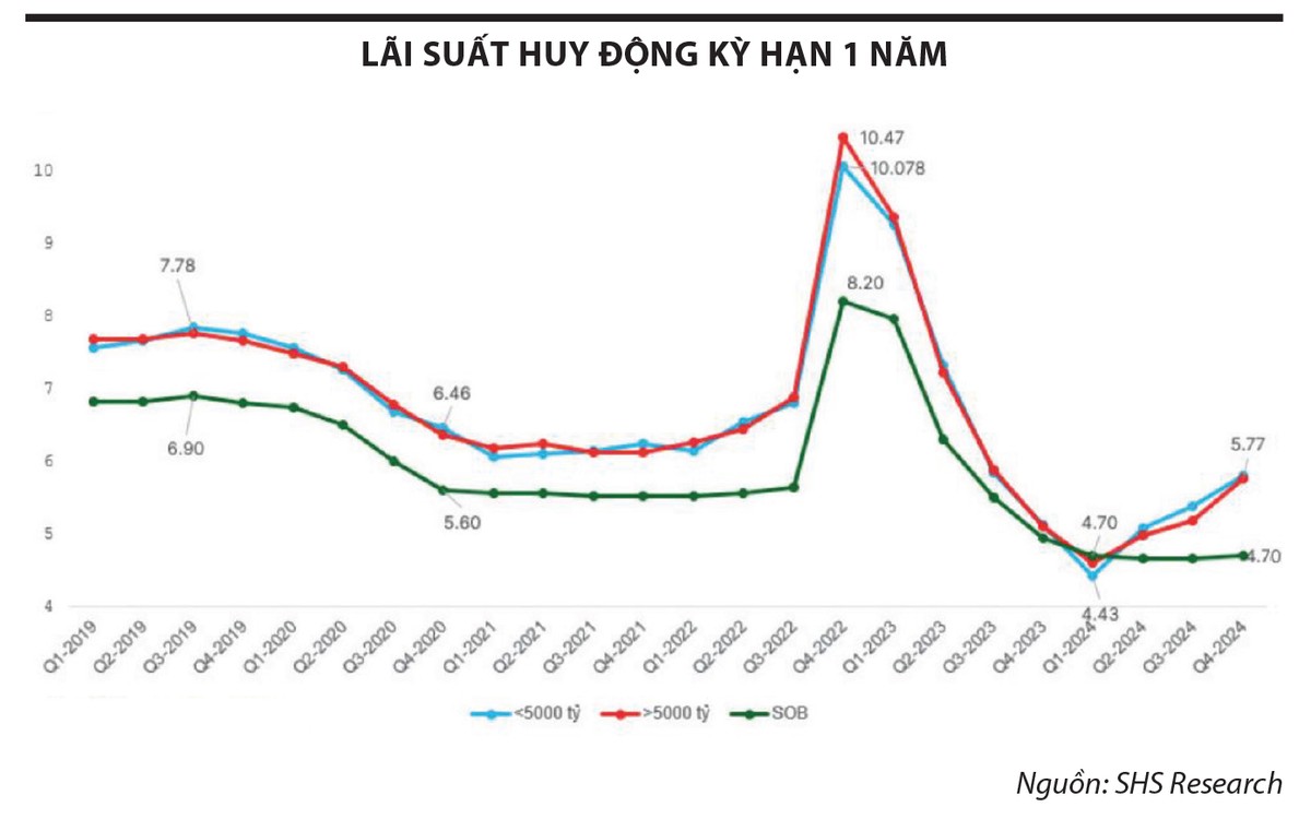 Mặt bằng lãi suất huy động và cho vay được dự kiến duy trì mức thấp trong năm 2025. Tỷ lệ tiền gửi không kỳ hạn (CASA) sẽ tiếp tục hồi phục nhờ vào sự gia tăng ứng dụng số và các chính sách thu hút vốn từ khách hàng cá nhân. Nhóm ngân hàng như VCB, MBB, TCB, MSB có CASA cao sẽ giúp cải thiện biên lãi ròng (NIM).
