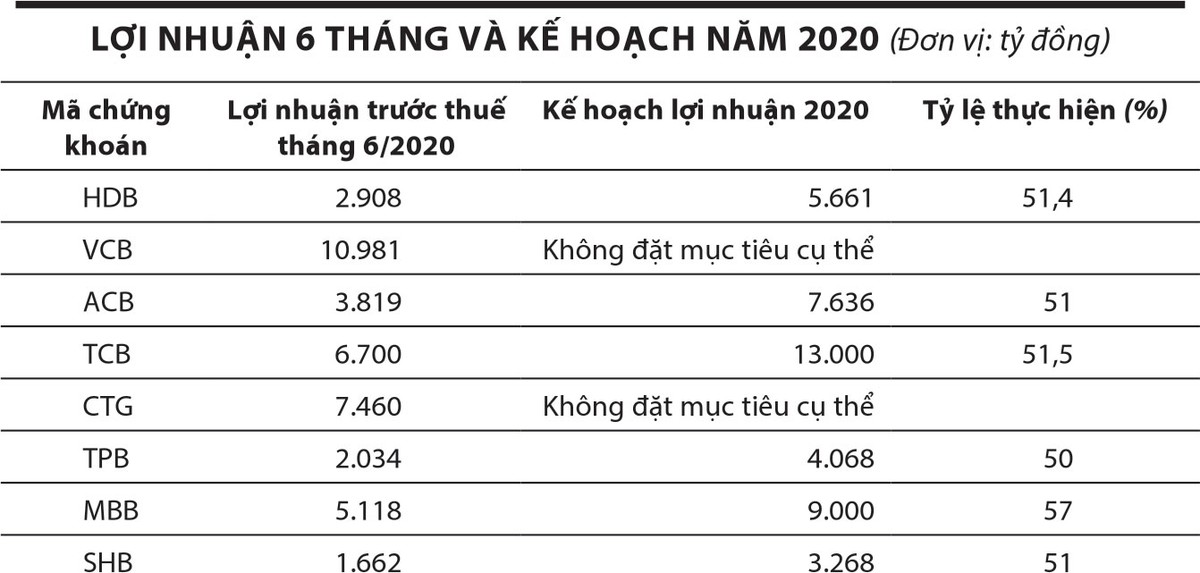 Một số ngân hàng có lợi nhuận nửa đầu năm giảm mạnh so với cùng kỳ. Chẳng hạn, lợi nhuận trước và sau thuế của EIB lần lượt là gần 552 tỷ đồng và 441 tỷ đồng, giảm 27,6% (riêng lợi nhuận quý II giảm 77%), do phải trích lập dự phòng cao. Năm 2020, EIB đặt mục tiêu lợi nhuận trước thuế đạt hơn 1.300 tỷ đồng, giảm 40% so với kế hoạch đưa ra đầu năm.