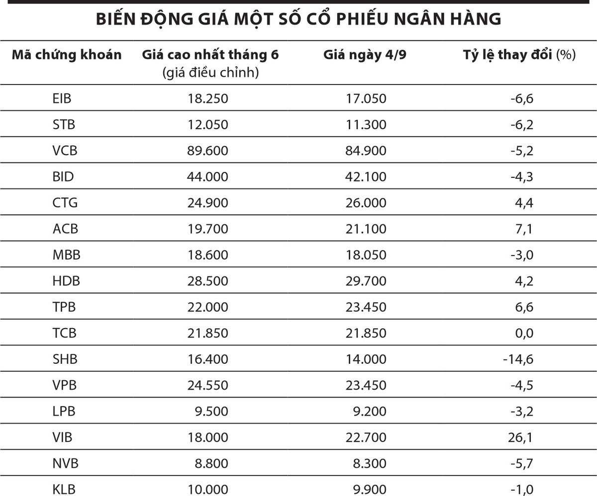 Vậy nhưng, thị giá nhiều cổ phiếu ngân hàng hiện thấp hơn mức cao từng đạt được trong tháng 6. Chỉ có một số ít mã đạt mức giá cao hơn, bao gồm VIB, ACB, TPB, CTG, HDB. Trong khi đó, không ít mã có mức giá thấp hơn tháng 6 như SHB, NAV, STB, EIB, BID, VCB…