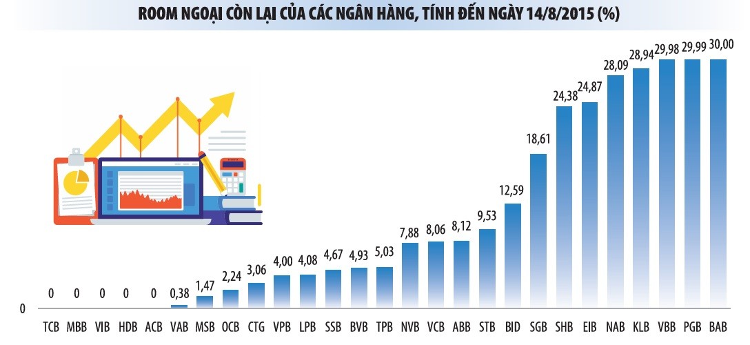 Trong khi đó, một số nhà băng dường như vẫn đang chờ đợi, thậm chí chưa sử dụng nhiều đến room ngoại, như Bắc Á Bank (0%), PGBank (0,01%), VietBank (0,02%), Kiên Long Bank (1,36%), Nam Á Bank (1,89%). Tỷ lệ room ngoại thấp không đồng nghĩa với việc cổ phiếu không hấp dẫn, mà có thể do quan điểm kiểm soát tỷ lệ cổ đông, “giữ chỗ” chờ đợi nhà đầu tư chiến lược…