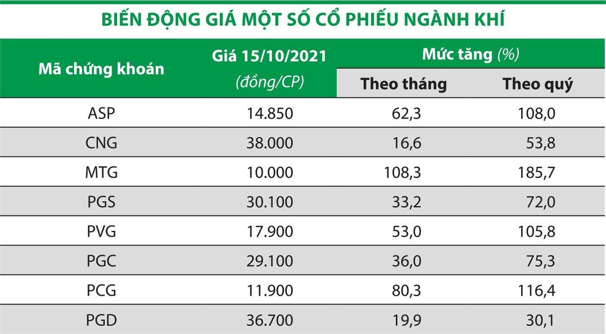 Cổ phiếu PVG và PGS ghi nhận mức tăng cao về giá và thanh khoản. Tính đến ngày 15/10, mã PGS tăng 33,2% sau 1 tháng và tăng 72% sau 1 quý. Mã PVG tăng 53% sau 1 tháng và tăng gấp đôi sau 1 quý.