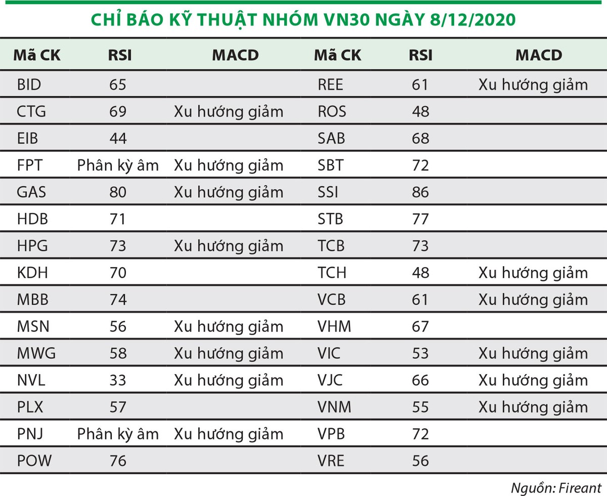 Sau giai đoạn thị trường liên tục tăng điểm kéo dài, các cổ phiếu bắt đầu bước vào vùng giá cao so với những năm trước, cũng như xuất hiện nhiều tín hiệu cảnh báo. Trong nhóm VN30, tính tới ngày 8/12/2020, có tới 20 mã cho tín hiệu đảo chiều, quá mua, chiếm 67% tổng số lượng cổ phiếu trong nhóm.