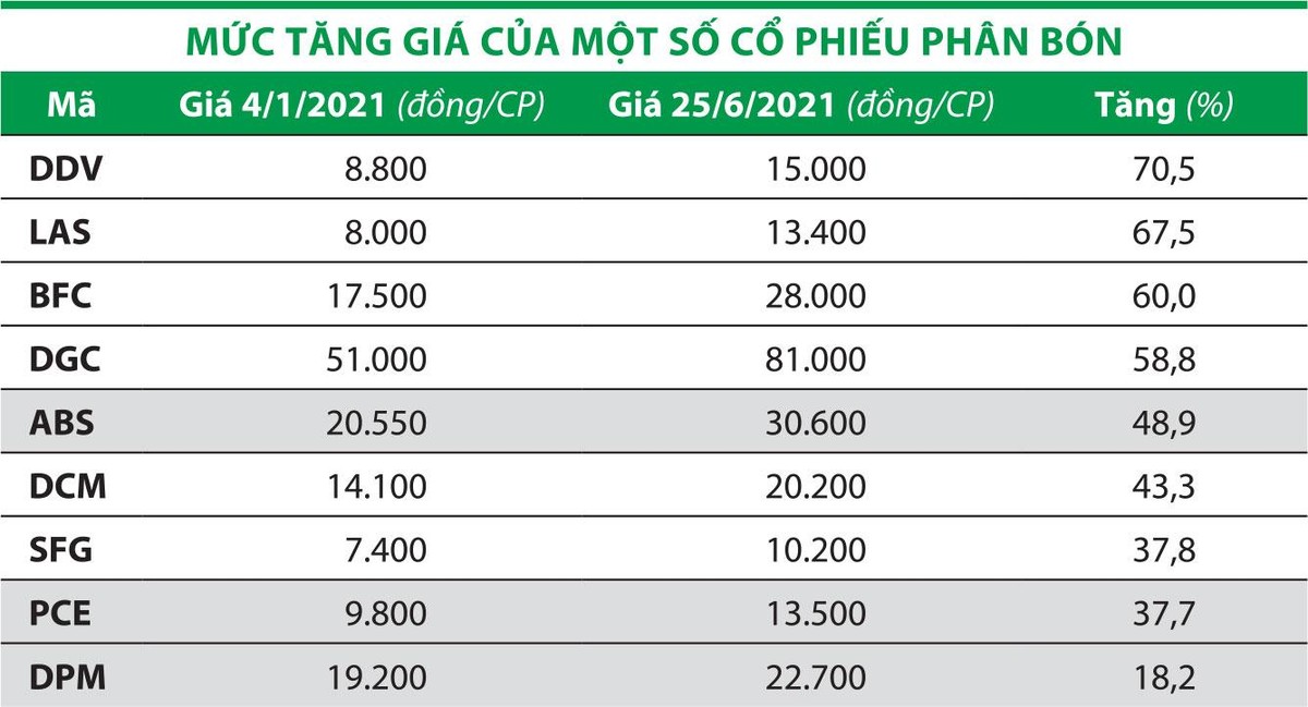 Nhiều cổ phiếu phân bón khác có mức tăng giá cao trong 6 tháng đầu năm 2021 như DGC của Công ty cổ phần Tập đoàn Hóa chất Đức Giang, BFC của Công ty cổ phần Phân bón Bình Điền, SFG của Công ty cổ phần Phân bón Miền Nam, PCE của Công ty cổ phần Phân bón và hóa chất Dầu khí Miền Trung…