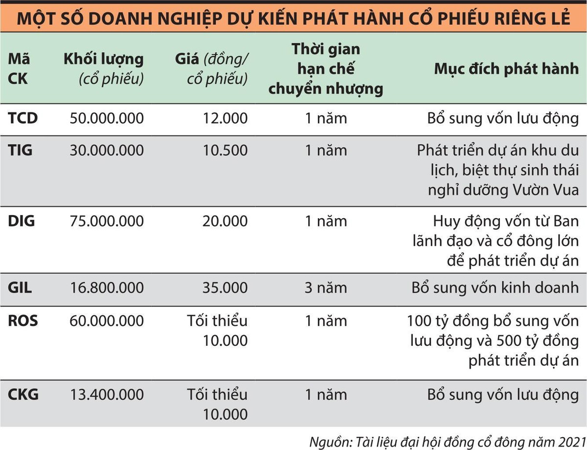 Tài liệu đại hội đồng cổ đông thường niên 2021 của các doanh nghiệp cho thấy, nhiều doanh nghiệp lên kế hoạch huy động vốn thông qua chào bán cổ phiếu cho cổ đông hiện hữu, bán đấu giá công khai trên Sở giao dịch chứng khoán, phát hành riêng lẻ cho nhà đầu tư chiến lược, phát hành riêng lẻ cho nhà đầu tư chứng khoán chuyên nghiệp.