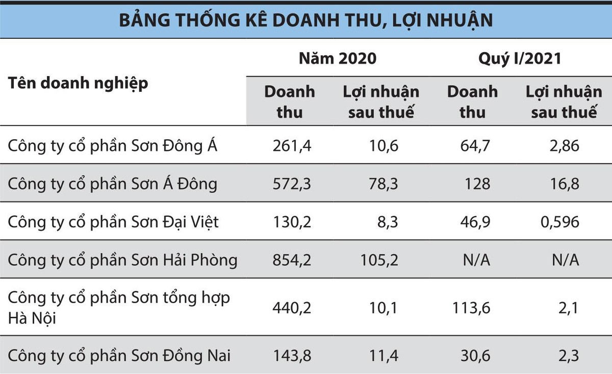 Trên sàn chứng khoán, hiện có một số doanh nghiệp sơn đang niêm yết/giao dịch cổ phiếu như Sơn Đông Á (mã HDA), Sơn Á Đông (mã ADP), Sơn Đại Việt (mã DVG), Sơn Hải Phòng (mã HPP), Sơn Tổng hợp Hà Nội (mã HSP), Sơn Đồng Nai (mã SDN)… Quy mô nhỏ, sức cạnh tranh yếu nên các doanh nghiệp này đang “bạc màu” trước sóng gió thị trường do đại dịch Covid-19 gây ra.