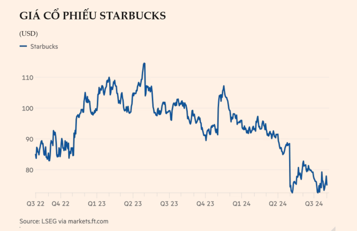 Cổ phiếu của Starbucks đã giảm 19,62% kể từ đầu năm đến nay trong khi Chỉ số S&P 500 chỉ tăng 9,63%. Cổ phiếu này đã về mức giá 75,29 USD/cổ phiếu, thấp hơn 30% so với mức giá cao nhất 52 tuần là 107,66 USD/cổ phiếu.