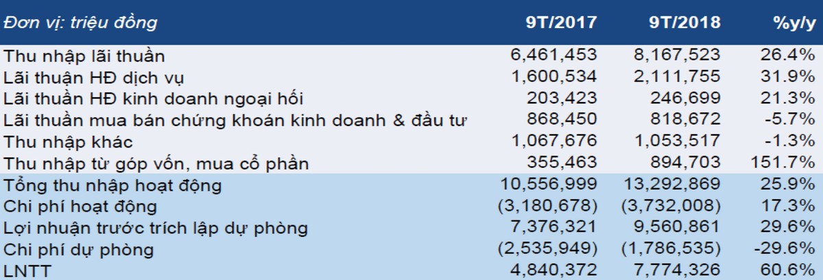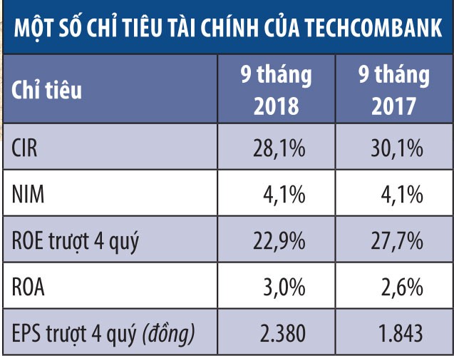 9 tháng năm 2018, Techcombank chứng kiến tăng trưởng thu nhập ở hầu hết các mảng kinh doanh. Cụ thể, thu nhập lãi thuần tăng trưởng 26,4%, đạt 8.168 tỷ đồng, chiếm 61,4% tổng thu nhập hoạt động kinh doanh.