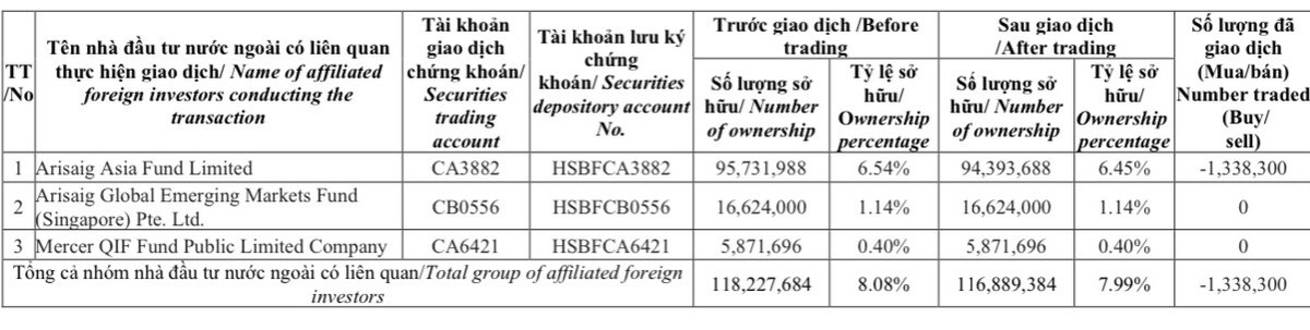 Trước đó, ngày 11/4, quỹ Arisaig Asia Fund Limited vừa bán ra 2.397.200 cổ phiếu MWG để giảm sở hữu.