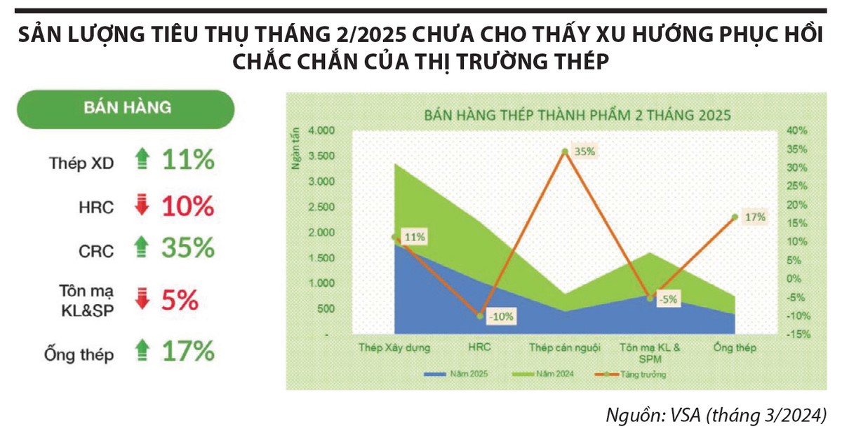 Số liệu của Hiệp hội Thép Việt Nam cho biết, trong tháng 2/2025, bán hàng thép thành phẩm đạt 2,4 triệu tấn, tăng 16,63% so với tháng 1 (tăng ở tất cả các mặt hàng, riêng thép cuộn cán nóng HRC giảm 10,06%) và tăng 29,8% so với cùng kỳ năm 2024 (tăng ở tất cả các mặt hàng, riêng thép cuộn cán nóng giảm 12,3%).