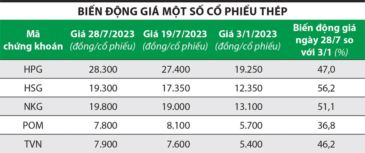 Sau khi giảm sâu trong năm 2022, giá nhiều cổ phiếu nhóm ngành thép có diễn biến đi ngang trong 5 tháng đầu năm 2023 và bật tăng kể từ đầu tháng 6 đến nay, nhất là các mã HPG, HSG, NKG, TVN.