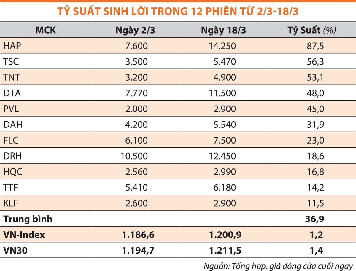 Trong đó, cổ phiếu HAP (của Công ty cổ phần Tập đoàn Hapaco) tăng tới 87,5% chỉ sau 12 phiên giao dịch tính từ 3-18/3. Cổ phiếu TNT (của Công ty cổ phần Tài Nguyên) tăng 53,1%. Cổ phiếu PVL (của Công ty cổ phần Đầu tư Nhà Đất Việt) tăng 45%… (xem thêm bảng).